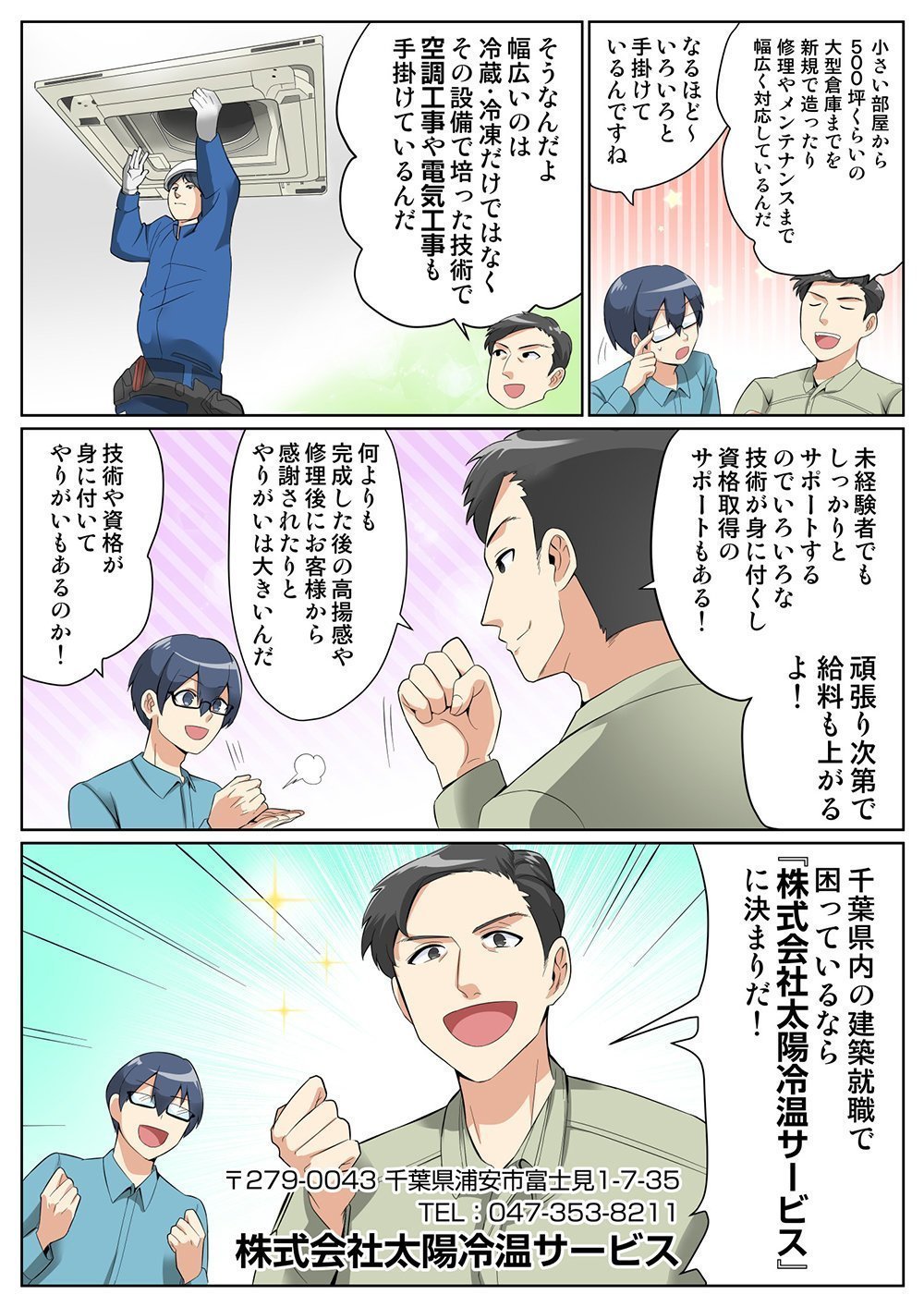株式会社太陽冷温サービスは千葉県浦安市で業務用冷蔵設備の設置、メンテナンスや空調工事、電気工事を手がけるスタッフを募集しています。スタッフのやる気には給料で応えますので、ぜひお気軽にご相談ください。幅広い施工で総合的にお客様のお困りごとを解決するやりがいがあるお仕事です。